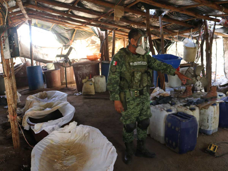 Elementos de la Secretaria de la Defensa Nacional aseguraron un laboratorio de metanfetamina en Sinaloa, considerado el más grande que haya sido localizado en México, para la producción de esta droga.