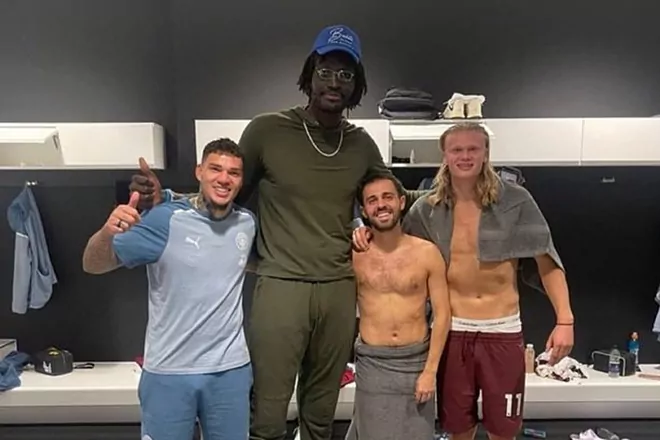 La estrella senegalesa Mamadou Ndiaye, que fue seleccionado en el draft de la NBA de 2016, se reunió con la plantilla del Manchester City tras su victoria sobre el West Ham. Y la estrella demás de dos metroe se elevó sobre Ederson, Bernardo Silva y Haaland en una foto.